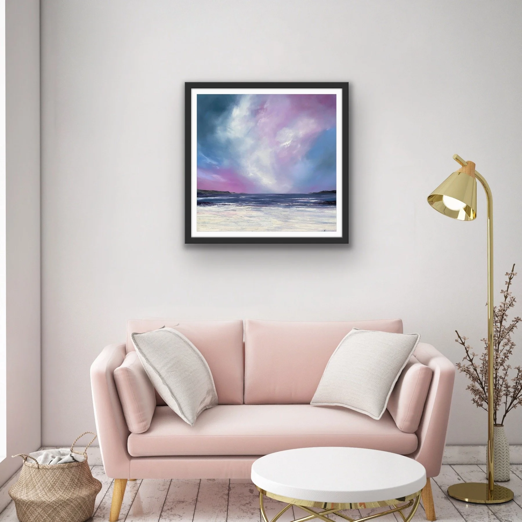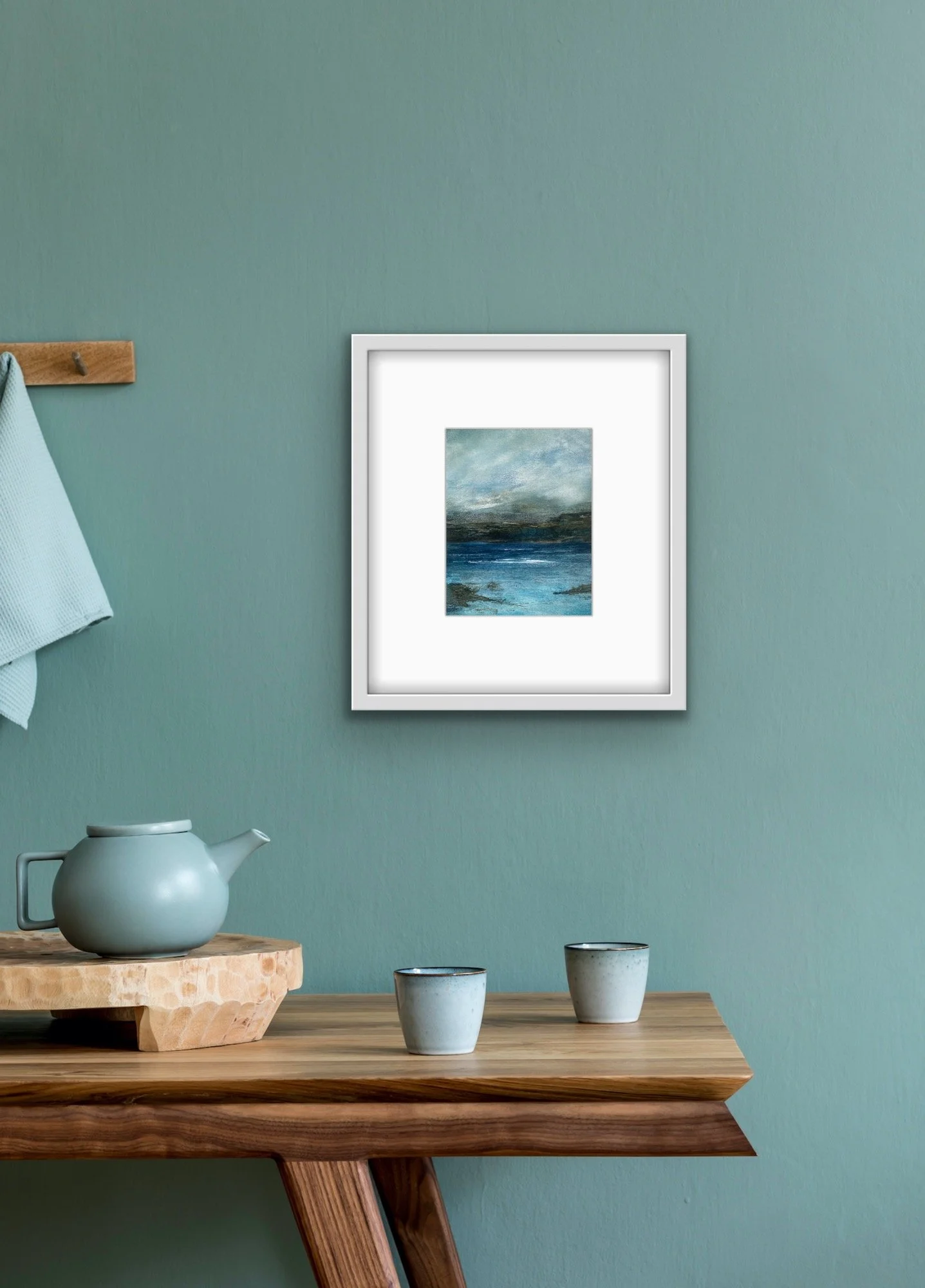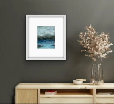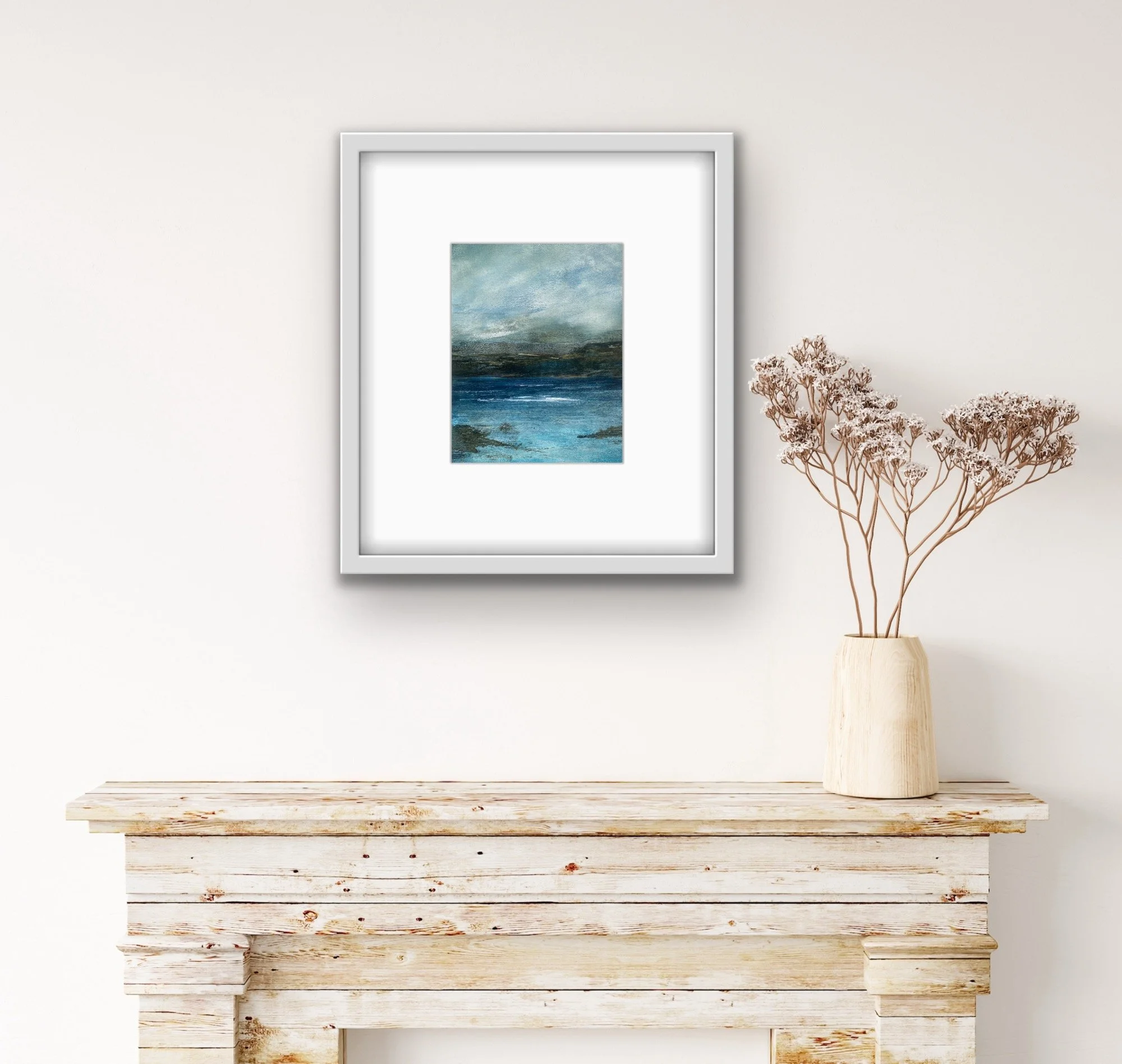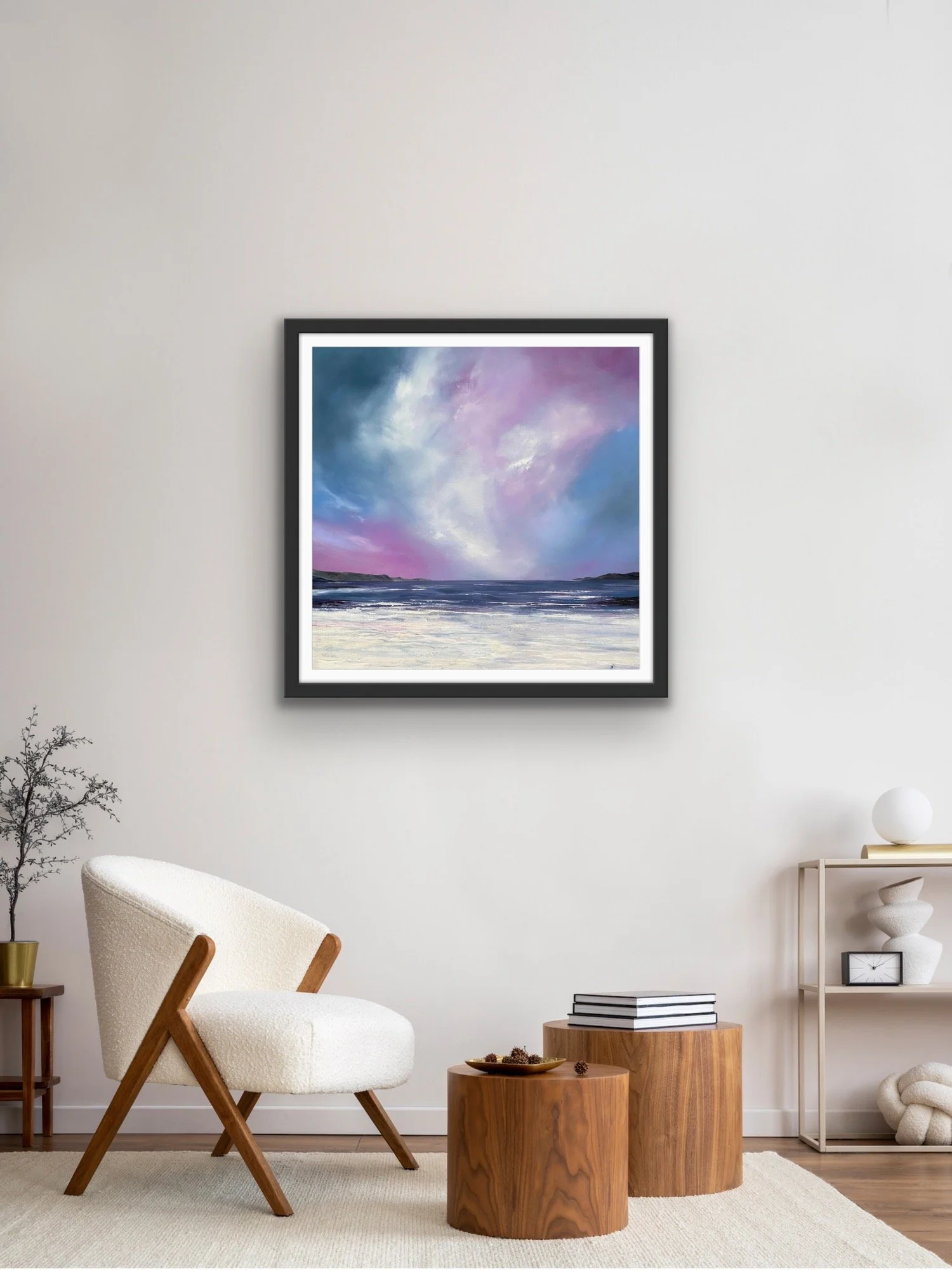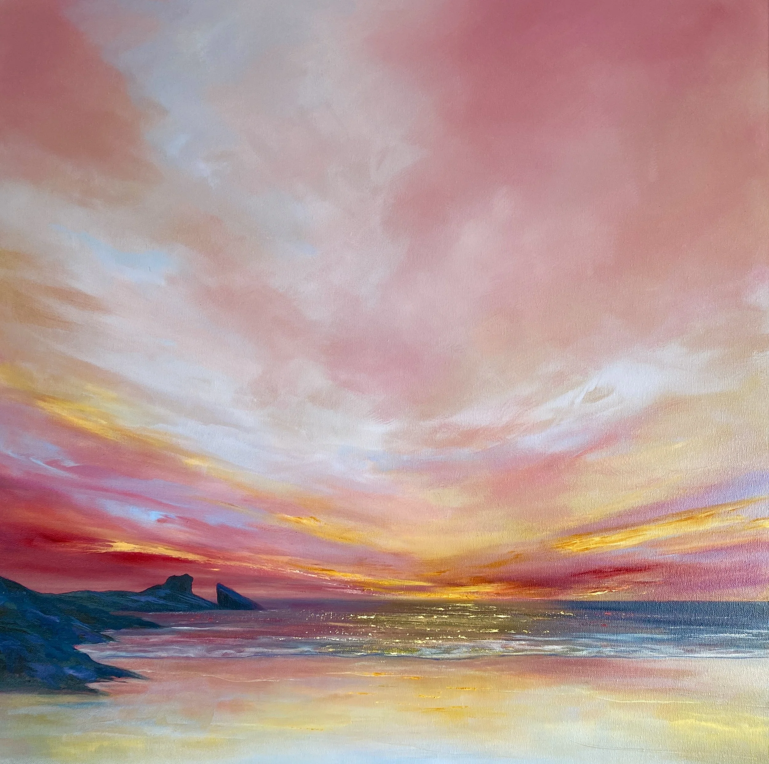 Standing on the clifftop above Hackley Bay in Aberdeenshire , the coastline stretches far into the horizon. What struck me was the juncture of the cliffs dipping into the sea. At this point we have an energy that is perpetual, neverending. A rhythm between land and sea. Coupled with a beautiful, calm sky, this gathering of the elements had to be captured on canvas. It’s a perfect addition to any space that seeks to evoke peace and relaxation.