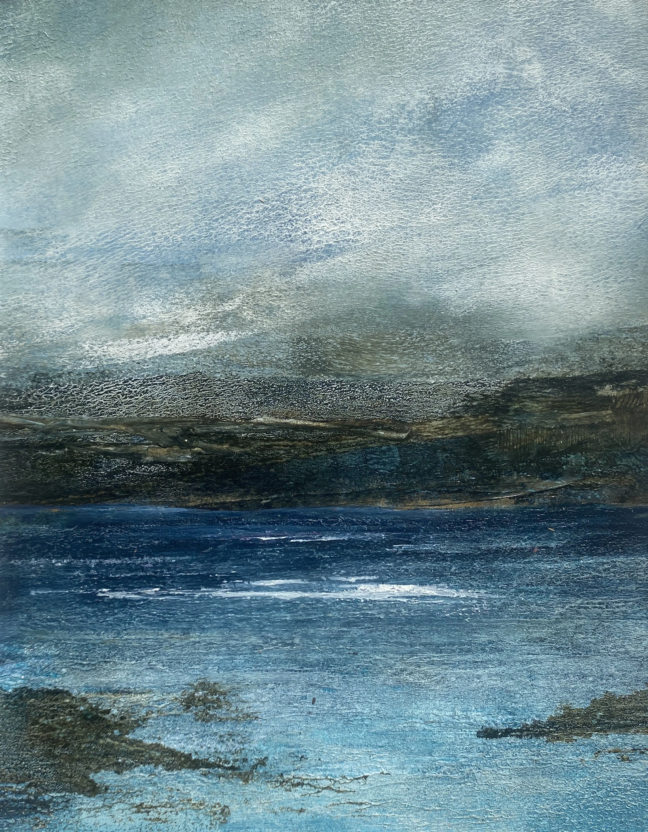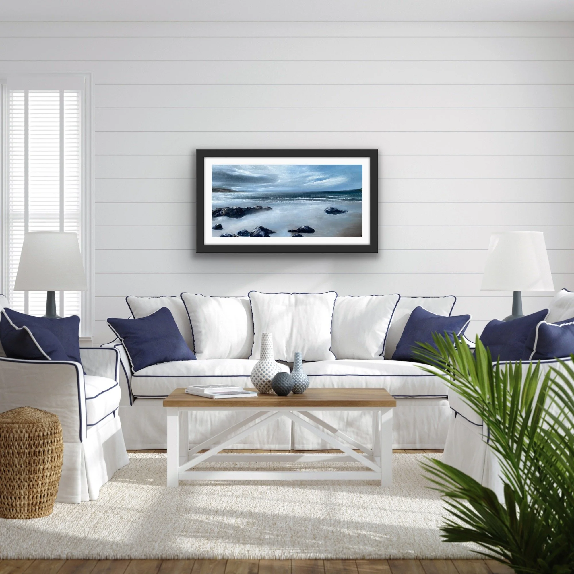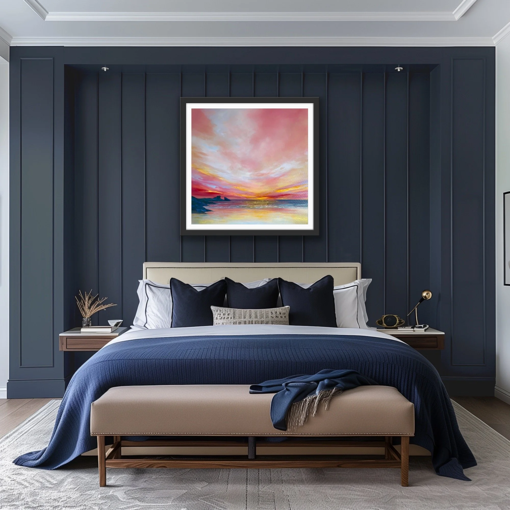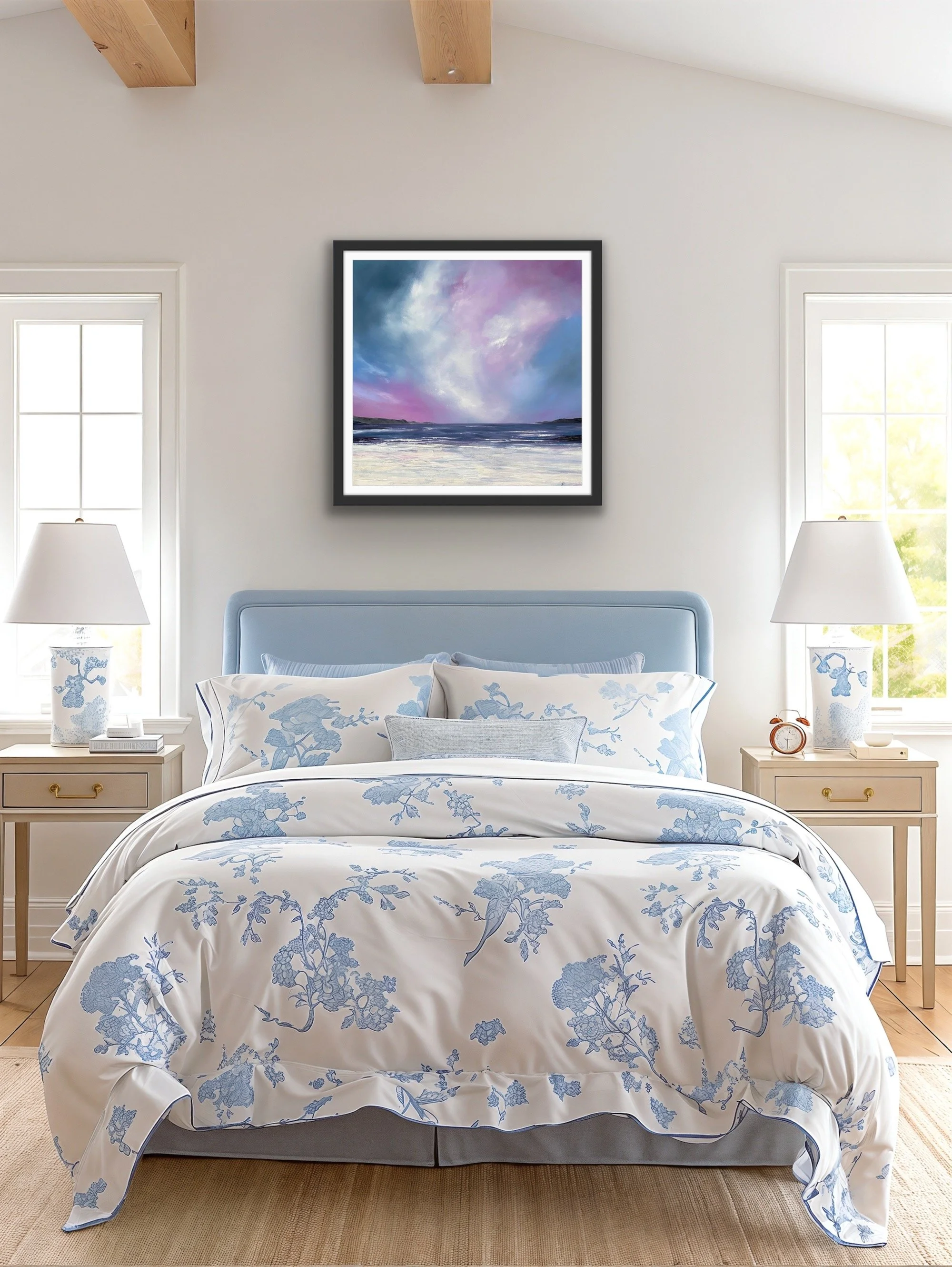 Standing on the clifftop above Hackley Bay in Aberdeenshire , the coastline stretches far into the horizon. What struck me was the juncture of the cliffs dipping into the sea. At this point we have an energy that is perpetual, neverending. A rhythm between land and sea. Coupled with a beautiful, calm sky, this gathering of the elements had to be captured on canvas. It’s a perfect addition to any space that seeks to evoke peace and relaxation.