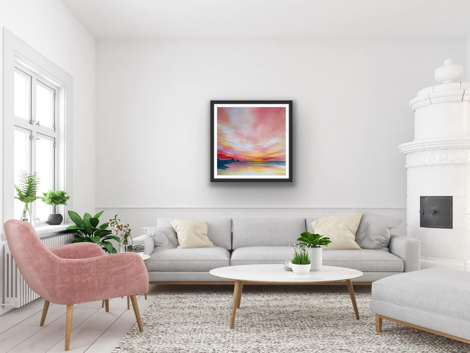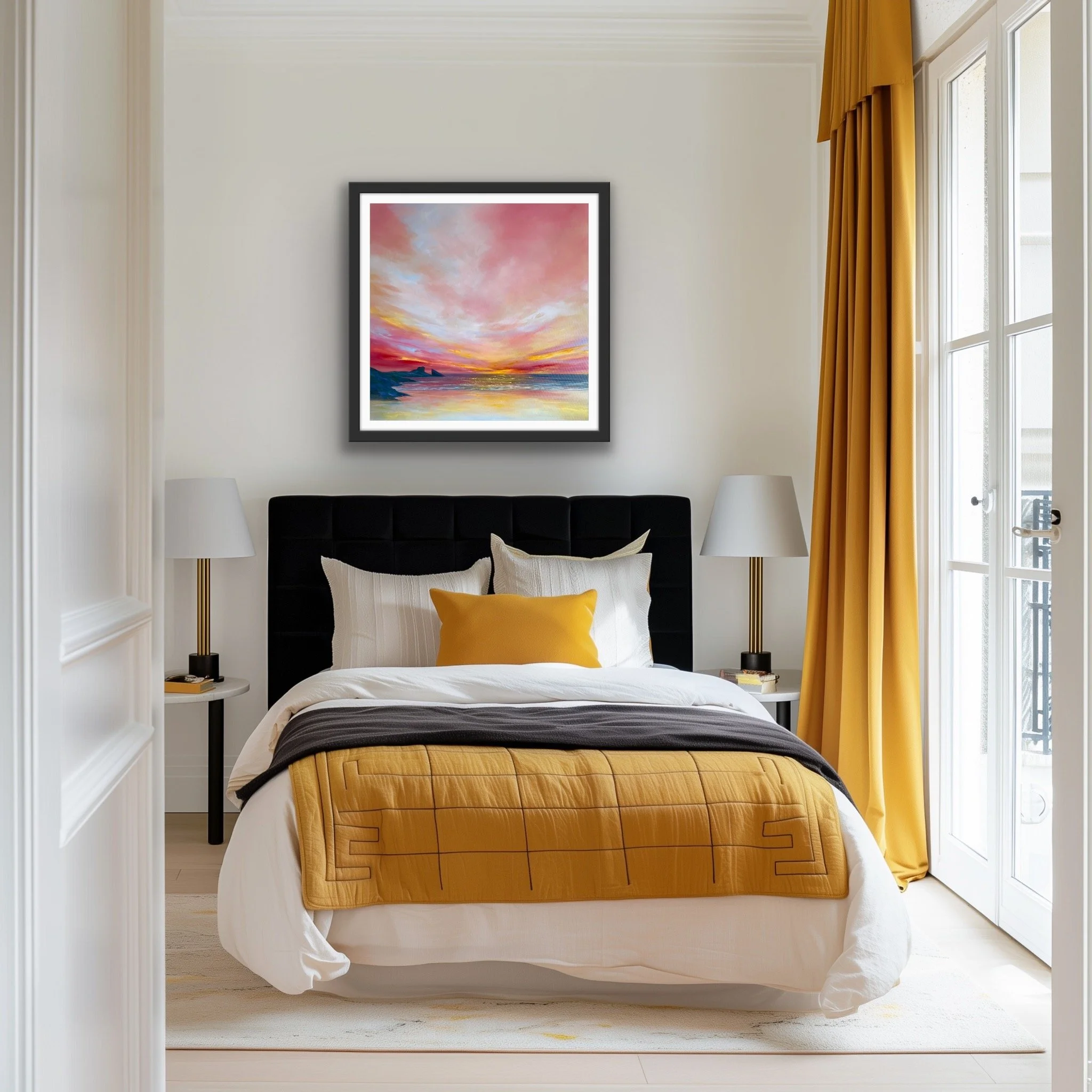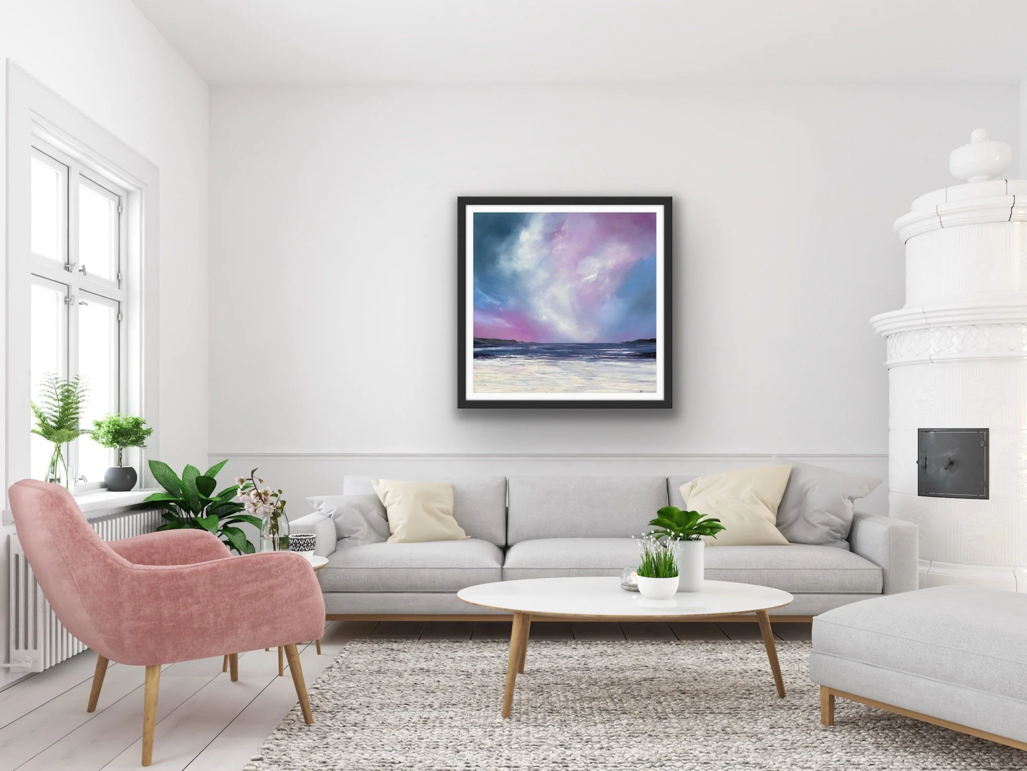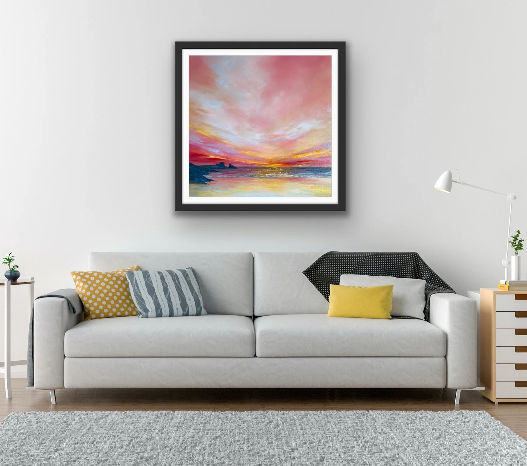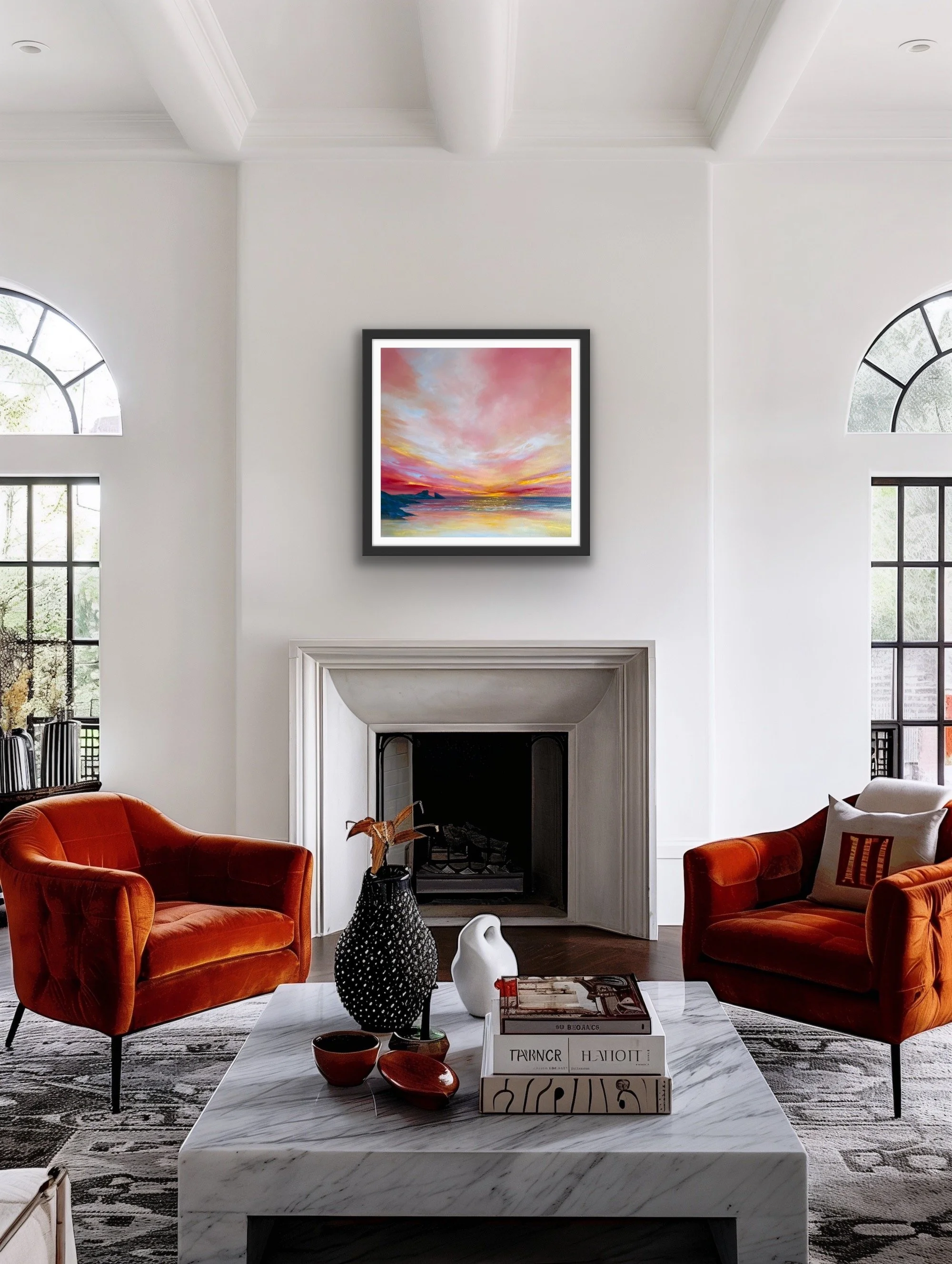 Standing on the clifftop above Hackley Bay in Aberdeenshire , the coastline stretches far into the horizon. What struck me was the juncture of the cliffs dipping into the sea. At this point we have an energy that is perpetual, neverending. A rhythm between land and sea. Coupled with a beautiful, calm sky, this gathering of the elements had to be captured on canvas. It’s a perfect addition to any space that seeks to evoke peace and relaxation.